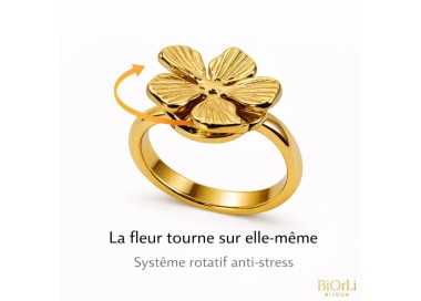 Ce produit est vendu chez BiOrLi. La particularité de cette bague réside dans sa fleur rotative. Grâce à un mécanisme discret intégré sous le motif, la partie supérieure tourne délicatement sous les doigts. Ce mouvement fluide procure un effet anti-stress apaisant et permet de relâcher les tensions au quotidien de manière discrète.